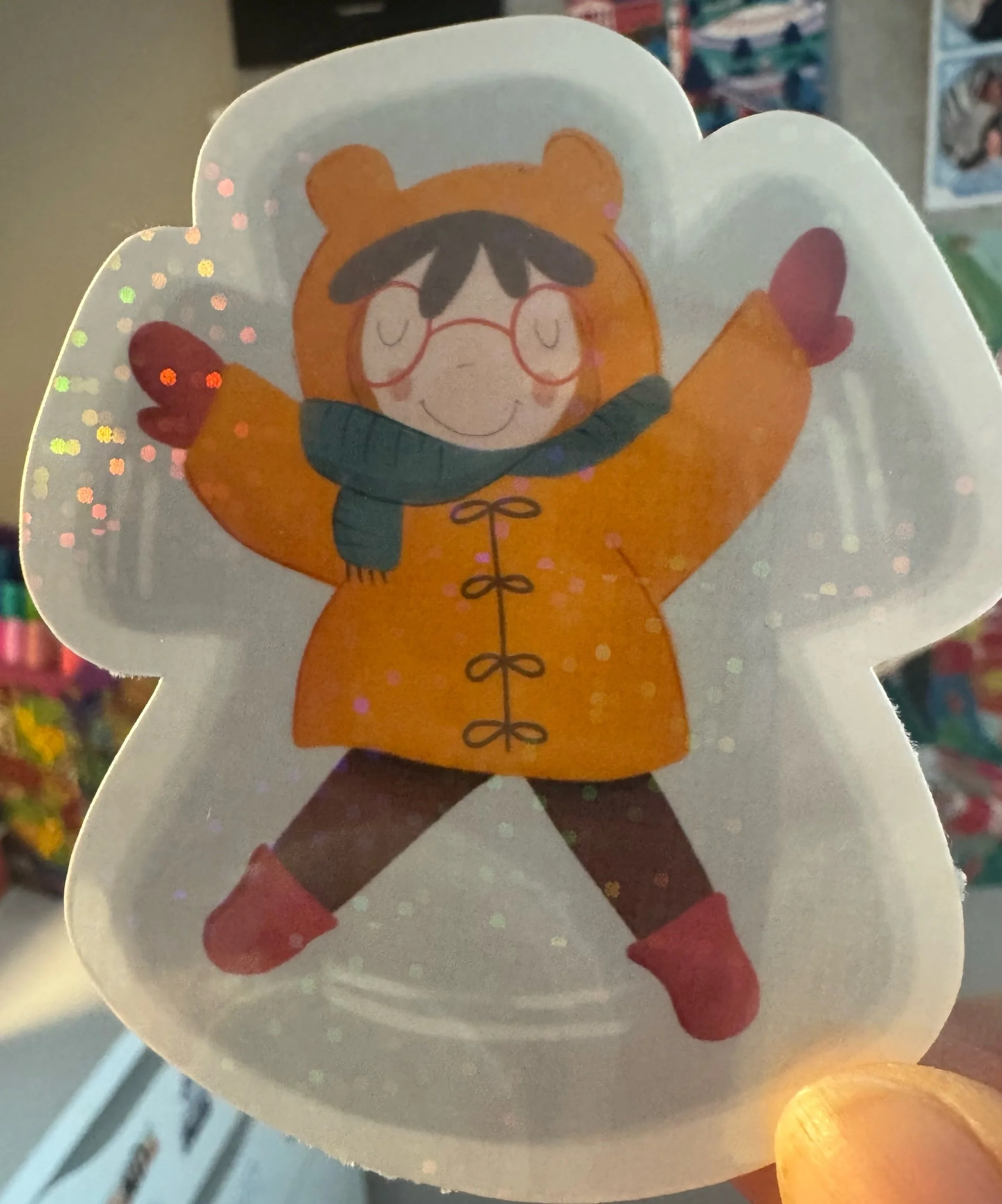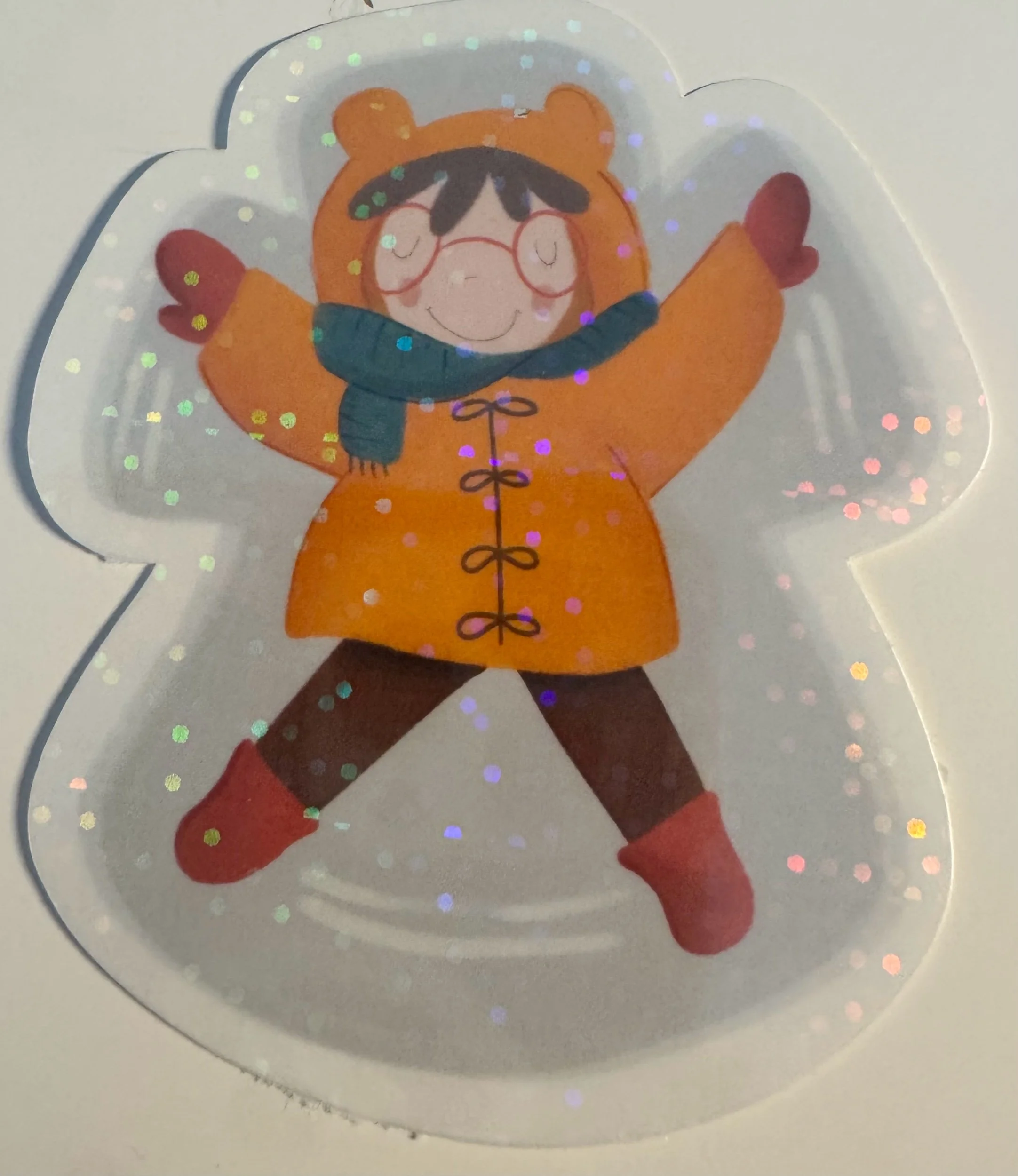 Bundle up in sparkle! This whimsical Joy Sticker Farm sticker features a cheerful winter character dressed in a cozy orange coat with bear ears, red mittens and boots, and a green scarf that screams “ready for snow day fun.” With arms and legs outstretched in a starburst of joy, this bespectacled cutie radiates warmth and wonder. The holographic finish adds a festive shimmer, making it perfect for water bottles, notebooks, or holiday gift wrap. Durable vinyl means it sticks through snowstorms and hot cocoa spills alike. Pure winter magic, with a wink.